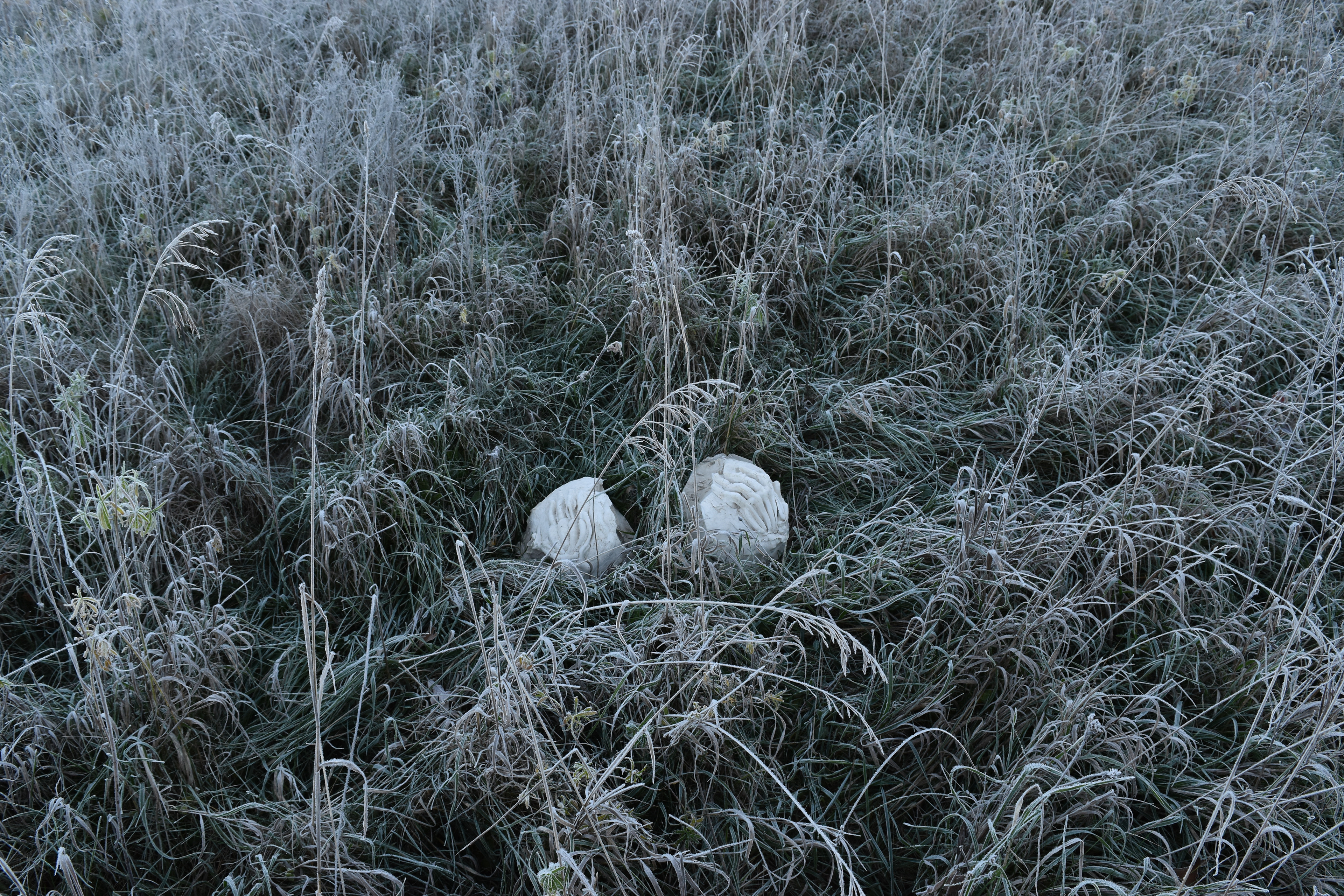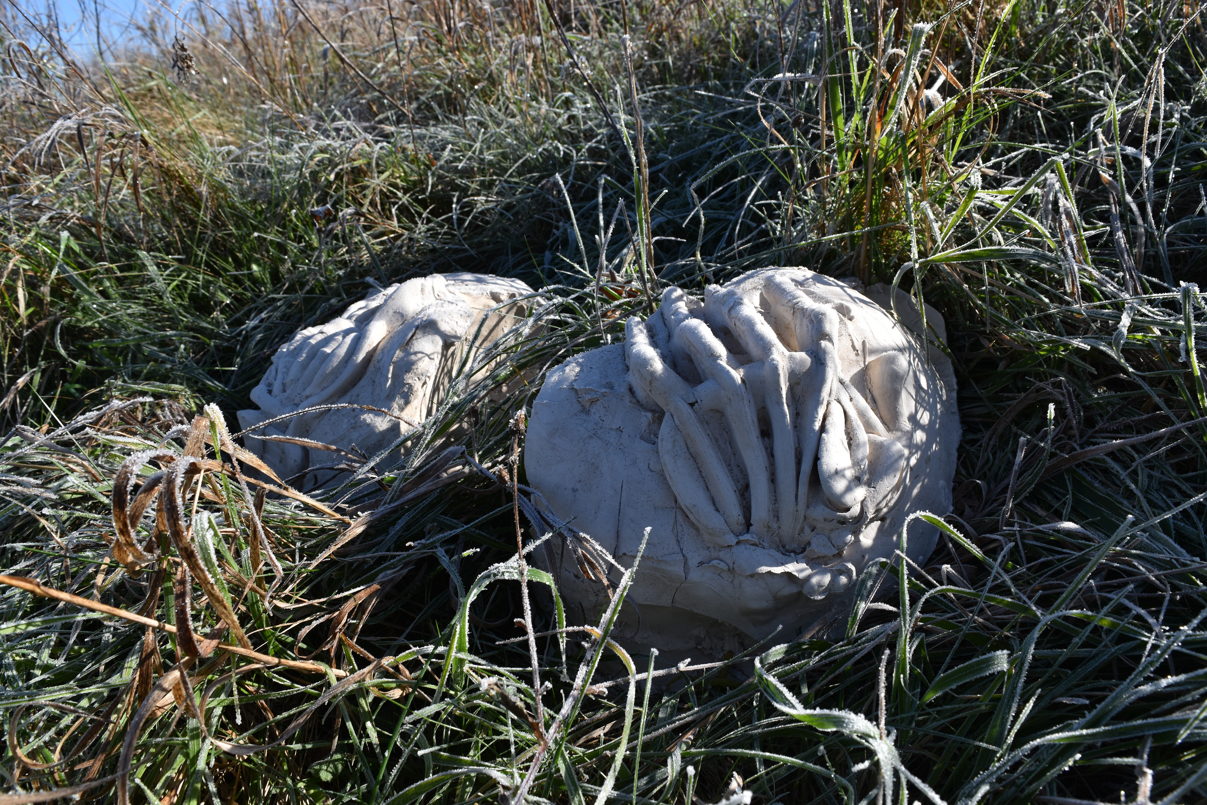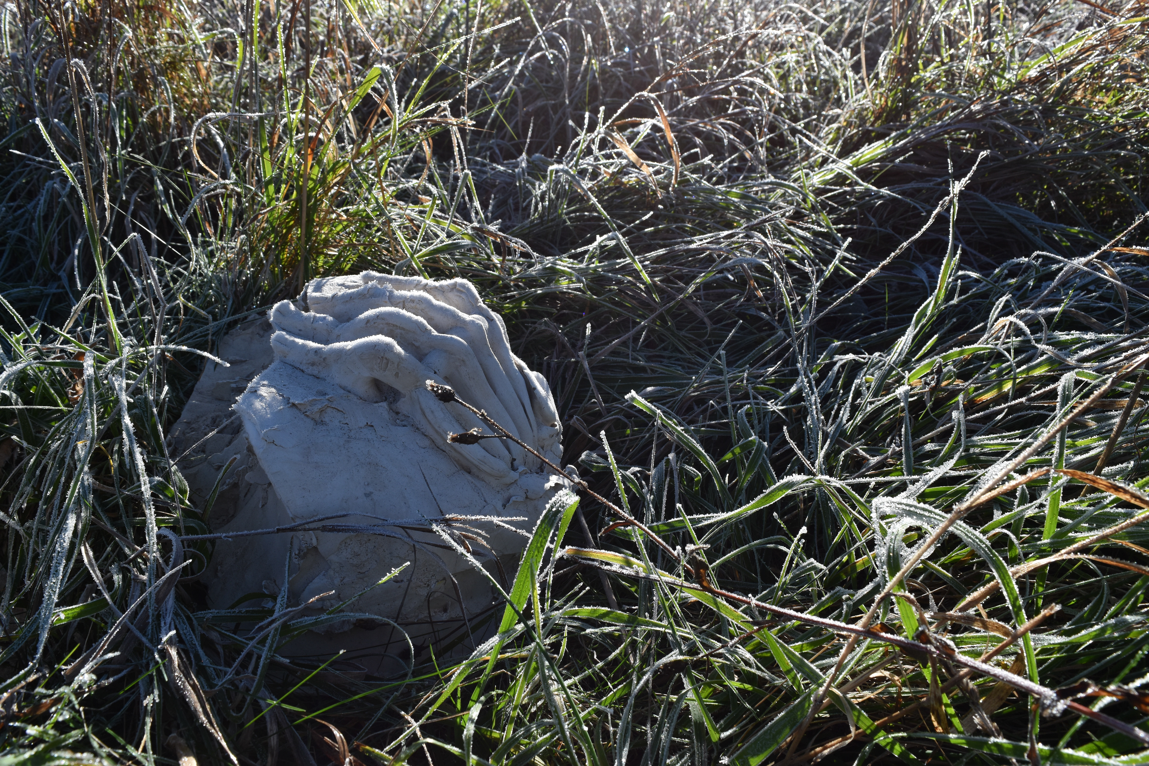 Hands gripping on mounds of the body or the earth. Frosty fingertips in a field at daybreak. These hands were drawn into clay and cast with plaster.