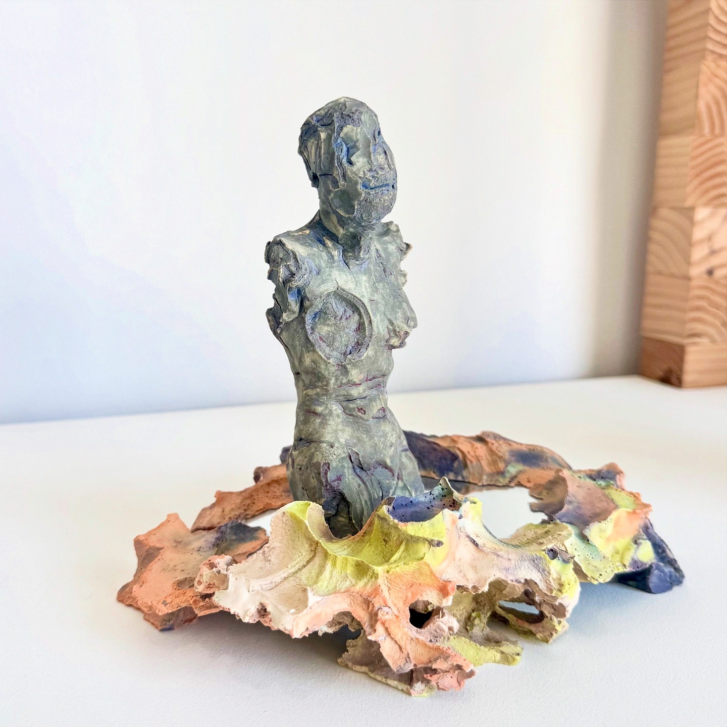Eroded woman on mirror pond, 8 x 8 x 6 in, Ceramic, mirror, aquaresin, 2021-2025