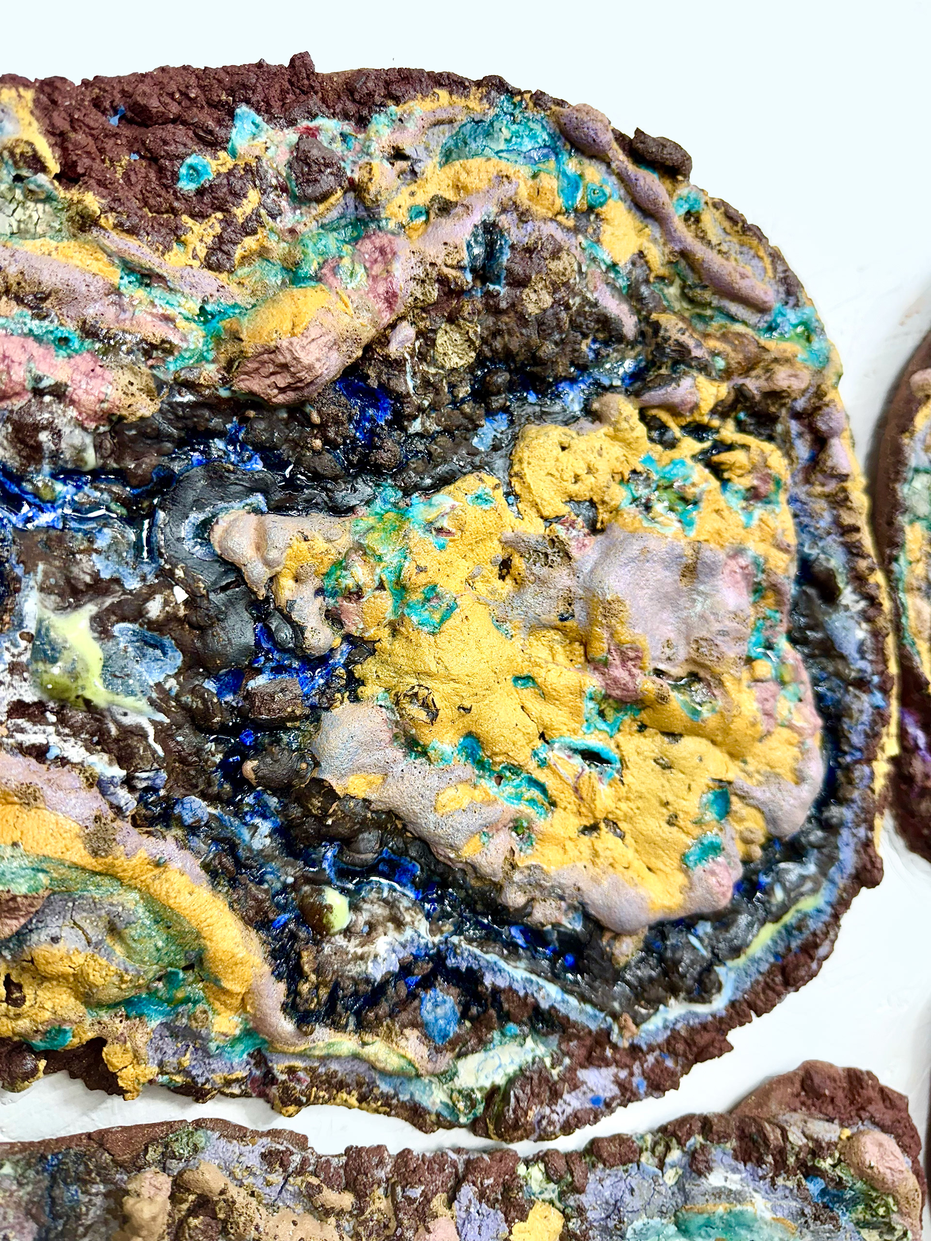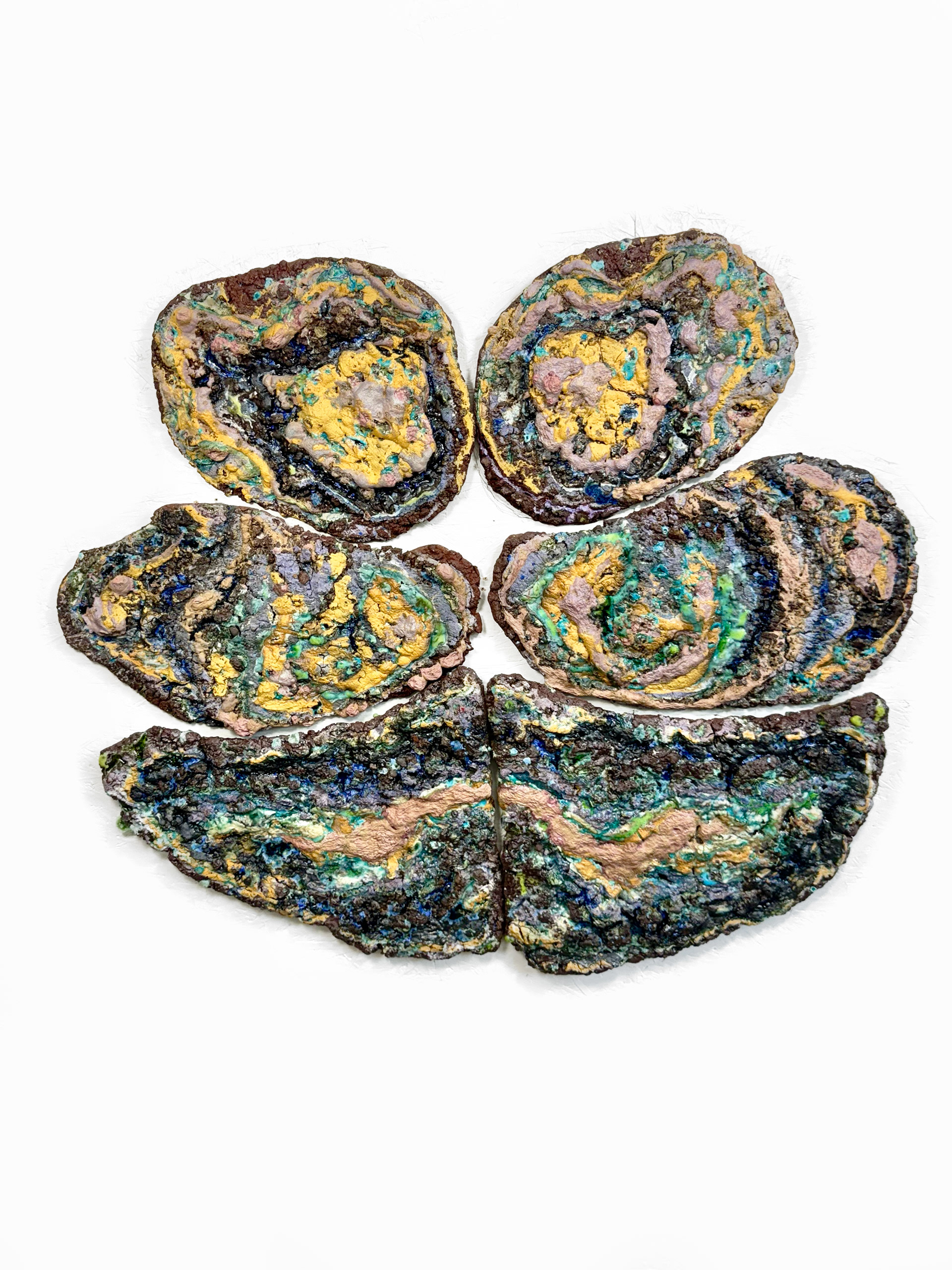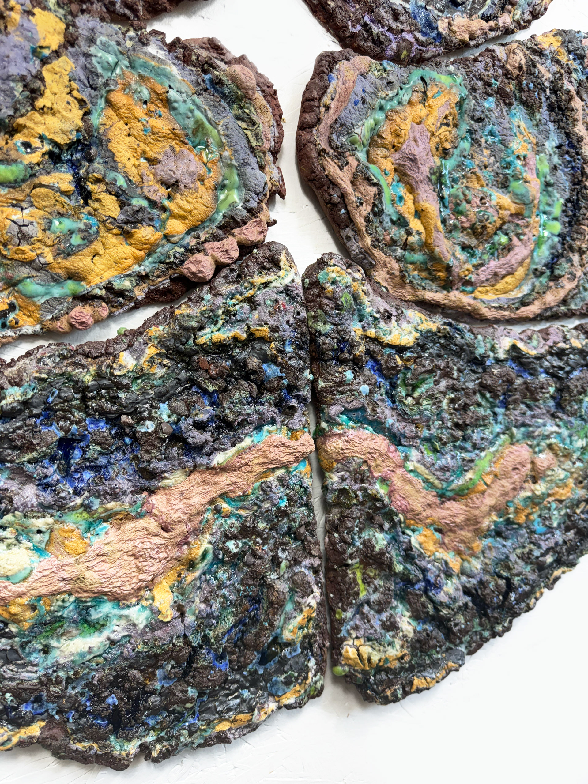 "Cookie" detail 2025 marbled ceramic materials including clay from local forest, crushed rocks and glass, beach sand 31 x 36 x 1 in